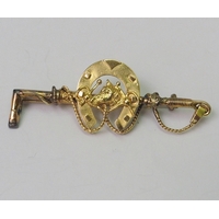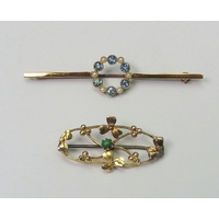 A bar brooch incorporating an applied spider motif set with synthetic aquamarine stones, yellow metal marked 9ct. 62mm long